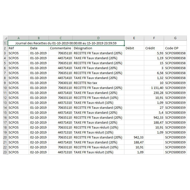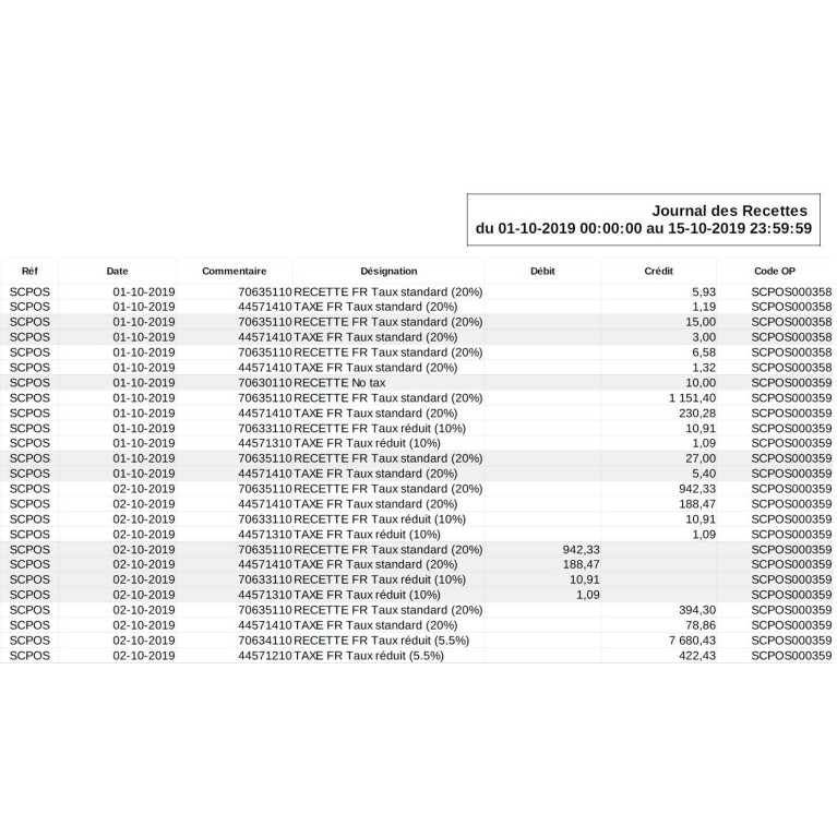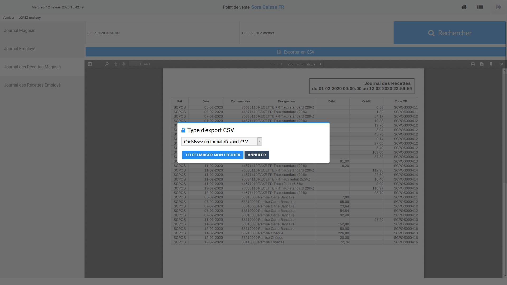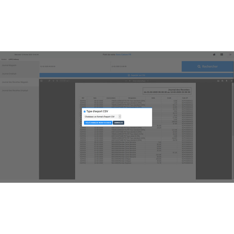 Le Journal des Recettes suit l'évolution de vos ventes au sein de votre boutique tout au long de votre activité. Vous pouvez extraire ce journal sur une période de votre choix afin de l'obtenir en format PDF ou CSV.